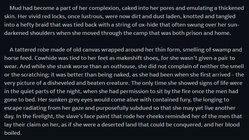 This is the very first thing I ever wrote for War Wine, almost immediately following the bardic inspiration dropped on me. It’s raw, edgy, skirting the edge of too much purple prose (in my opinion – I try to save that for poetry, aha). I remember wanting to capture the exact images and smells that I was visualizing, and then got “carried away” until it became a whole ass book.