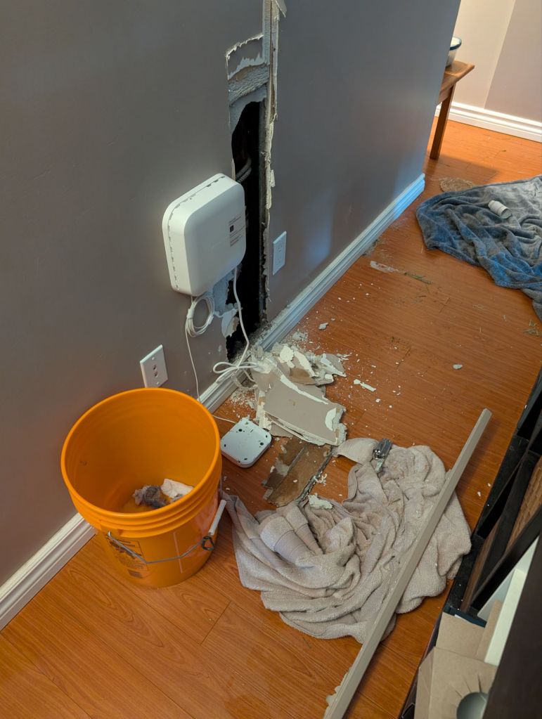 Last Sunday, we had a 4″ cast iron pipe burst in our living room – our first home shenanigans! We were very lucky, all the water pooled into a low point in our floor so we didn’t lose anything furniture, possessions, electronics, nothing. And bless the wall that it burst in held around 3′-4′ of water, because it wasn’t bubbling or sagging at all. If it hadn’t started to leak out from underneath the wall itself, we’d never have known. The plumbing and restoration humans have been amazing, coming out to our place on a Sunday so quickly. We’ve had dehumidifiers running since last weekend, and they were finally removed on Monday. Now we wait for the drywall repairs, and then we’ll need to start pricing out a new floor.